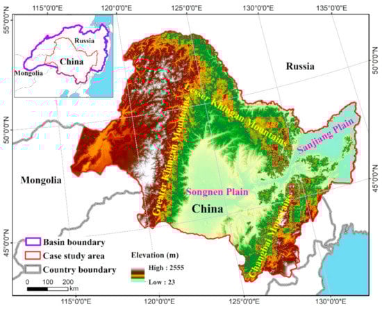 The Amur River Basin ranks the tenth largest watershed in the world. The area of the CARB is 890,308 km2, including parts of the Jilin and Inner Mongolia provinces and the whole Heilongjiang province (41°45′N to 53°33′N, 115°13′E to 135°05′E, Figure 1). The Greater Khingan, Lesser Khingan and Changbai mountains are located in the western, northern, and eastern side, respectively. While the Songnen and the Sanjiang Plain are situated in the interior and northeastern, respectively. The Ussuri and Songhua rivers are major tributaries of the CARB [26,27].
