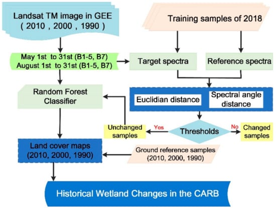 In recent years, individual geoscientists who are interested in geospatial analysis have benefited from the Google Earth Engine (GEE) platform [24,25]. This cloud-based platform has introduced possibilities for automatic training sample migration and supports RF-based wetland mapping. Thus, the aim of this study was to track historical changes of wetlands on the CARB based on Landsat images. To achieve this goal, we sought to (1) operate an automatic training sample migration method which could form historical training sample collections of the CARB for the time periods of 2010, 2000, and 1990; (2) based on the historical training sample collections, we applied RF classifier to map wetlands and other land cover; and (3) analyzed dynamics and conversions of wetland on the CARB. The methods and discussion will contribute to remote sensing and management of the wetlands around the world.