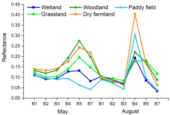 Analyzing the spectral similarity and difference among different land covers is the first step for a classification task based on remote sensing. In this study, 200 ground survey samples for each land cover type were selected randomly. Then we overlaid these samples with the 2010 Landsat 5 images obtained in May and August 2010. Figure 4 shows the surface reflectance of typical land covers. It is as expected that the general shapes of the spectral curves were similar, especially in bands 1–3 which revealed a considerable overlap of both May and August. In the spectral region of band 4 (760–900 nm) in May, the reflectance of woodland was similar to dry farmland, while in band 4 of August, woodland was much lower than dry farmland. By comparison, the reflectance of wetland was obviously different to paddy field. These spectra can be considered as an important estimate to map different land covers on the CARB.