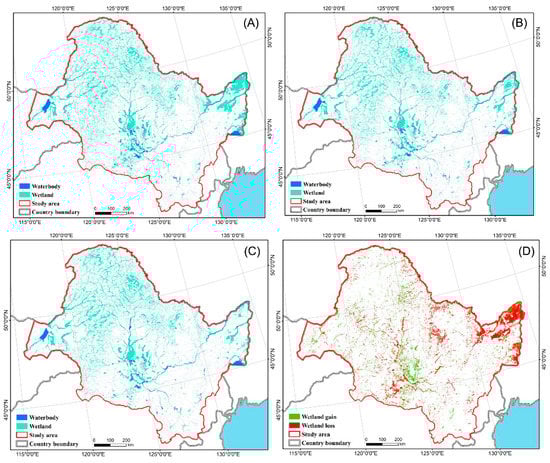 Geographical distributions of wetlands and waterbody on the CARB. (A) Wetland and water body in 1990; (B) Wetland and water body in 2000; (C). Wetland and water body in 2010; (D) Loss and gain of wetland during 1990–2010.