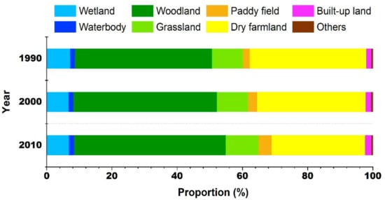 The changes of spatial extents and areas of different land covers from 1990 to 2010 are presented in Table 5, Figure 6 and Figure 7. In 1990, the total CARB wetland area was about 89,432 km2, within which marsh, occupying approximately 93% of whole wetlands area, was the most common wetland type. The area of water body on the CARB was 17,964 km2. On the CARB, woodland, dry farmland and grassland were the most common types, occupying 42%, 36% and 10%, respectively.