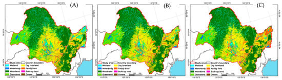 Spatial pattern of land covers of the CARB in 1990 (A), 2000 (B), and 2010 (C).