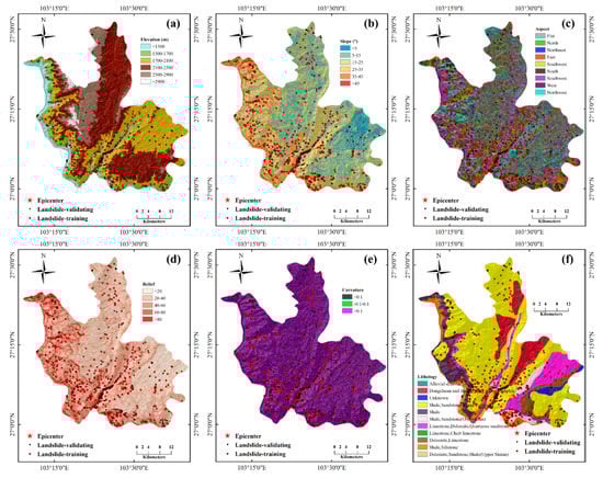The digital elevation model (DEM) in the study area is obtained from the ASTER Global Digital Elevation Model. Figure 3a shows the DEM in the study area, which has a raster format with a cell size of 30 × 30 m. The elevation has a 0.1 m vertical resolution, ranging from 747 to 3314 m. The other topographic indices, including the slope angle, slope aspect, relative relief, and curvature, are derived from the DEM. Ludian County has a total area of approximately 1487 km2, 88% of which is mountainous areas.