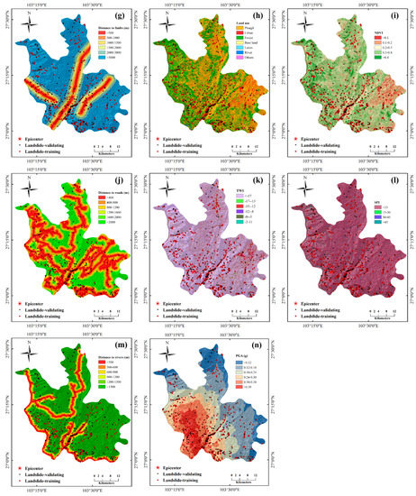 Landslide conditioning factors. (a–e) Topographic factors: (a) elevation, (b) slope, (c) aspect, (d) relief, and (e) curvature); (f,g) geological factors: (f) lithology and (g) the distances to faults; (h–j) land use and land cover factors: (h) land use, (i) NDVI, and (j) the distances to roads; (k–m) hydrological factors: (k) TWI, (l) SPI, and (m) the distances to rivers; and the (n) geophysical factor: PGA.