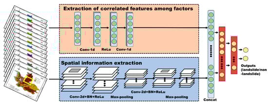 The proposed hybrid model aims to capture the hidden but useful information automatically from the landslide inventory using the CNN architecture. First, the landslide datasets should be properly organized before being fed into the CNN-based model. In the work of reference [26], the landslide factors were stacked together and regarded as a “multi-channel image” to meet the need of the CNN input. Similarly, in the present study, we consider the landslide inventory as a “multi-spectral remote sensing data” that contains the spatial and spectral information. Here, “spatial” refers to the spatial property of a landslide as the natural hazards, and “spectral” describes the correlated features among each conditioning factor that contributes to a landslide. All the landslide conditioning factors mentioned in Section 2.3 are stacked pixel-to-pixel into 14-band spectral data. Then, as is operated in the hyperspectral remote sensing-related literature [46,47,48,49], the CNN architecture is used to extract the landslide features from both the spectral and spatial dimensions. Figure 5 shows the structure of the proposed hybrid model, which contains three parts: spatial feature extraction, spectral feature extraction, and feature fusion.