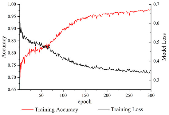 Model hyperparameters generally exert a strong impact on the performance of machine learning methods; thus, it is necessary to execute a tuning process before model training [55]. In this work, all the hyperparameters of the hybrid model, including the numbers and sizes of the filters, batch sizes, activation functions, optimizers, and the neurons in the hidden layers, were determined based on a five-fold cross-validation, as shown in Table 2. Figure 7 shows the training losses and accuracies over 300 epochs using backpropagation and gradient descent algorithms. It can be seen that the model accuracy shows fluctuations at the early stage; then, it increases over time and finally stabilizes after approximately 300 epochs. A similar trend was shown in the model loss, which suggested that the model converged. In other words, the model we obtained learned an implicit correlation between a landslide and its environmental conditions.