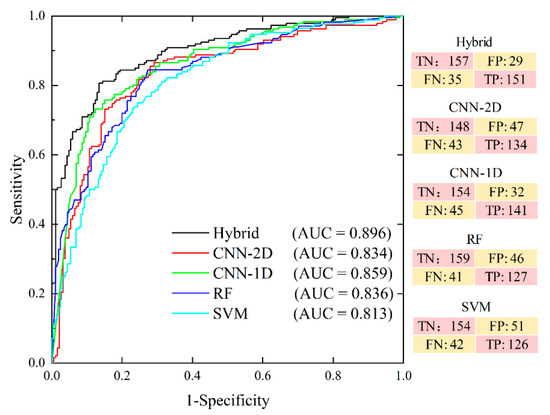 The AUC value estimated using the ROC curve provided a direct comparison of the different models. As shown in Figure 10, the maximum AUC (89.6%) in the validation set was obtained for the proposed hybrid model and followed by CNN-1D (85.9%), RF (83.6%), CNN-2D (83.4%), and SVM (81.3%). These results indicated that the proposed model was the best-performing model for predicting landslide occurrences in comparison to the four benchmark models. Specifically, the AUC of the proposed hybrid model was 6.2% and 3.7% higher than the pure CNN-2D and CNN-1D models, respectively.