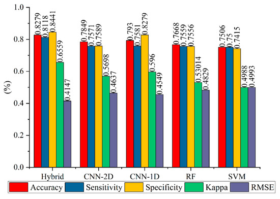 Figure 11 shows the Accuracy, Sensitivity, Specificity, Kappa, and RMSE values of the proposed hybrid model and four benchmark models in the validation set. It can be seen that the proposed hybrid model achieved the best results compared to the other four benchmark models. In terms of Sensitivity, the proposed hybrid model achieved the highest Sensitivity value of 81.1%, which was approximately 5% higher than that of the CNN-1D model (75.8%), followed by CNN-2D, RF, and SVM, respectively. These results demonstrated that the proposed hybrid model showed a better performance in correctly classifying the landslide samples as landslide locations compared with the four benchmark models. A similar result was also observed in the Specificity values, which indicated that the proposed hybrid model outperformed the others in terms of accurately classifying the non-landslide locations. In addition, the Kappa index results indicated that the proposed model (0.656) had the highest index value, followed by CNN-1D (0.596), CNN-2D (0.569), RF (0.530), and SVM (0.499).