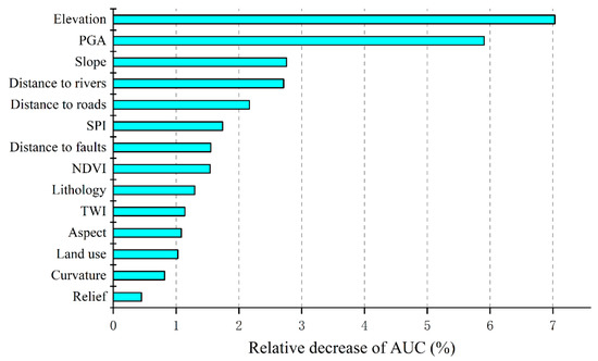 A preliminary analysis on the relationship between the conditioning factors and landslide occurrences was presented in Section 4.1, while the effect of a single factor on the modeling results remains unclear. To tackle this, a sensitivity analysis of 14 conditioning factors based on the Jackknife test was implemented to explore the contribution (i.e., importance) of each factor to the proposed susceptibility model. Figure 12 shows the results in terms of the relative decrease of the AUC values. It can be observed that the three most important factors are elevation, PGA, and slope, respectively. The elevation has the highest RD value of ~7% when eliminated in the proposed model, which demonstrated a high contribution to the modeling results. The second most influential factor was the PGA, which got an RD value of 5.9%. Numerous studies have demonstrated that there is a high correlation between the occurrence of co-seismic landslides and PGA [38,56]. Our study confirmed that the PGA factor should be considered for mapping the earthquake-induced landslide susceptibility. Besides, it is worth noting that the factor of the distances to the faults that sometimes used to substitute the effects of earthquakes did not show a high RD value compared with the PGA. One possible reason for this result is that earthquakes are not always triggered by fault activities, as reported by Chang et al. [57]. Overall, all the factors used in this study contributed to the modeling results, but the importance of the related landslide conditioning factors still needs to be explored in different study areas.
