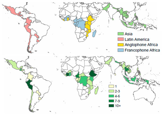 Countries participating in each workshop and number of participants per country. Two of the workshops were in English (Asia and Anglophone Africa), with one workshop in Spanish (Latin America) and one in French (Francophone Africa).