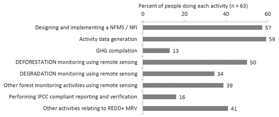 Workshop participants were selected by the GFOI partners working with the relevant agencies in their priority countries (often government agencies responsible for forest monitoring). Participants were selected based on their expertise in the field and their position within the institution. Participants therefore have the potential to influence country MRV strategies and could have the opportunity to train others on what they had learned. In both cases, the workshop offered free-of-charge access to expertise and training, as well as international networks. Six months after the workshop, 62% of respondents were working more on REDD+ MRV than before the workshop and were working on a number of relevant activities (Figure 6). Only three (5%) of the workshop participants were no-longer working on REDD+ MRV six months later. Although participants in the webinars were self-selected, the majority were actively working on REDD+ related tasks, so the training was reaching a relevant audience. Only 6% (n = 64) of those who responded to the impact survey after the webinars were no longer working on any REDD+ related tasks when they filled out the impact survey. In terms of reaching participants able to influence the progress of REDD+ MRV on the ground, the selection process for the workshop participants may be more effective. For example, Laos, Central African Republic (CAR), and Gabon (FCPF and UNREDD countries) did not participate in the webinars, but their participation in the workshops, in contrast, was facilitated by the donors. One barrier for their participation in the webinar may be because they were in English, while the workshop was in French (CAR and Gabon are francophone).
