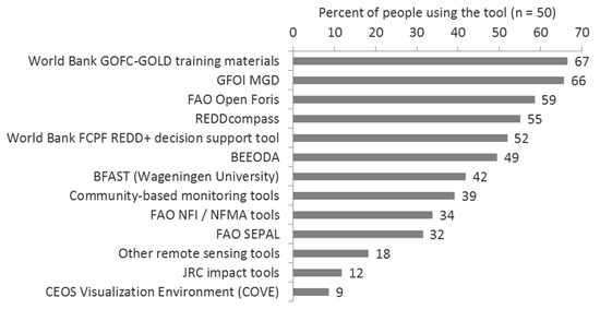 In general, both workshop and webinar participants were satisfied with the training given. This matched findings from [14]. The webinar participants were asked after the webinar if they found the webinars clear and understandable, and scored the webinars 4.2 on a scale of 1 to 5 (n = 634), where 5 is very clear, and 1 is not clear. For relevance, they scored 4.3 (n = 636), where 5 is very useful, and 1 is not relevant. Ninety-five percent of workshop participants rated the workshop as good or excellent overall. However, in the detailed feedback for both the webinars and the workshops, many participants highlighted the technical nature of the work, for which face-to-face interactions better facilitate comprehension. This may also explain why the guidance materials were used the most (World Bank GOFC-GOLD training materials and GFOI MGD), as even in the workshop some participants mentioned that more time is required to be able to fully engage with the more technical tools (Figure 7) in contrast to guidance materials, which are more easily used. Of those participants who participated in one of the regional workshops and also the webinar series, and who responded to our survey (six people), all but one said that they preferred workshops due to the advantages of being able to interact with experts. Having the participants travel to the workshops was a positive experience, as it allowed side-meetings with other countries and organizations to be arranged at the same time, thus increasing the efficiency of the event-saving both time and travel costs.