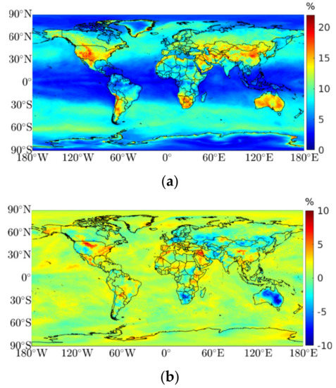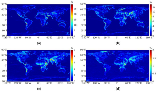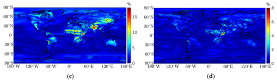 Usually, other models adopted 5° × 5°, 2.5° × 2.5°, or 1° × 1° horizontal grid resolutions to estimate the model coefficients. However, even when considering the highest resolution grid, the water vapor present in a cell can have significant variations. In order to investigate the extent of this variation, the standard deviation for the mean value () and each periodicity ( and ) were calculated for each window of 4 × 4 grid points (about 12,544 km2), which was approximately the 1° × 1° horizontal grid. Figure 2 shows the average of the standard deviation calculated for each amplitude. For the mean value, variations up to 28% can be found at the Andes and the west coast of the African continent, and about 20% on the west coast of the United States and Australian coasts, among other places, but with a greater incidence on the land-sea boundaries where complex atmospheric interactions occur (Figure 2a). The annual, semi-annual, and quarterly amplitudes display almost the same spatial pattern (Figure 2b–d). Although the semi-annual and quarterly amplitudes show higher variability in regions far from the coast, all three amplitudes show a higher variability incidence in the south of the Asian continent, mainly between the Himalayas and the north of the Taklamakan Desert, the African continent, and the west coast of the United States (Figure 2b–d). Combining all amplitudes, we found variations up to 48% in cells of 1° × 1° horizontal resolution, which are not considered by the other models in the literature, that can have a significant impact on the ZTD and ZWD estimation. Such variations justify the use of a full ERA5 spatial resolution for applications that require the highest precision in estimating relative humidity.