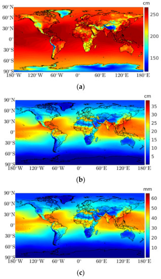The HGPT2 uses the Saastamoinen wet model (Equation (8)) to obtain the ZWD, and the ZTD is the sum of the two components, the ZWD and the ZHD (calculated using the Saastamoinen hydrostatic model [8]). Figure 4a,b shows an example of the ZTD and ZWD calculated for 1 August 2020, 12:00 UTC. As expected, the ZTD decreases with altitude (lower surface pressure), showing smaller values in mountain regions and higher values at sea level, namely along the equatorial region, due to the presence of high levels of water vapor (Figure 4a). Figure 4b also reflects that ZWD tends to decrease as the latitude increases, since the ZWD depends significantly on the temperature and water vapor pressure. The ZWD quantity can be easily converted to PWV using a constant of proportionality () and interpreted as the height (length units) of an equivalent column of liquid water that would result if the water vapor were condensed (Figure 4c). The atmospheric water vapor has an active role in dynamic processes that shape the atmosphere’s global circulation, and its simulation is challenging due to its high variability in time and space. In the HGPT2, the PWV is calculated based on Equation (9), that uses meteorological surface variables, estimated from different periodicities, to obtain the ZWD and .