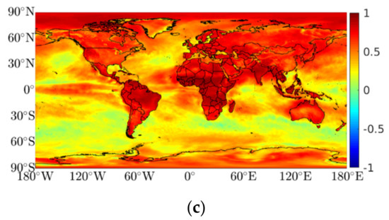 where and represent the covariance and variance, respectively. Figure 5 shows the mean relative humidity RMSE, bias, and Pearson correlation coefficient (). Lower RMSE values can be found on polar and tropic zones, with higher values in the temperate zones (well-defined wet and dry seasons), mostly inland. The mean global RMSE is 7.17%, inland 8.2%, and over oceans 6.5% (Figure 5a). Figure 5b shows the mean bias, where positive values indicate an overestimation of the HGPT2, notorious in the central zone of the United States and over Iraq and Syria. The negative values indicate an underestimation, with greater incidence in Mainland Australia and South Africa. The mean global bias is 0.9%, overland 0.8%, and over oceans 0.9%. The correlation is strong inland, with a mean value of 0.6 (which increases to 0.8, if we exclude Antarctica), and less strong over oceans, with a mean value of 0.4.