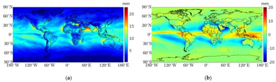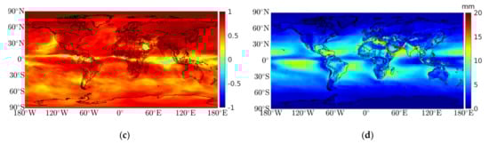 PWV maps were calculated every hour during 1 year (2020) and compared with the maps calculated by ECMWF using the simulations of the ERA5 model. Figure 6a–c displays the mean RMSE, bias, and Pearson correlation coefficient. The mean global RMSE is 5.0 mm, inland 3.5 mm, and over oceans 5.7 mm. The highest RMSE can be seen over the Red Sea, Arabian Sea, and north of Bengal Bay. The smallest values are found at the poles, where the amount of water vapor is almost non-existent (Figure 6a). The mean bias values show a similar behavior, with a mean bias near zero at the poles and higher values at the tropics and temperate zones, with a global mean bias of –0.2 mm (0.8 mm inland and –0.8 mm over the oceans)—see Figure 6b. The correlation is strong inland, with a mean value of 0.74. Areas without correlation can be seen throughout the tropics, the west coast of the United States, and the Arabian Peninsula. The global mean value is 0.7, and over the oceans 0.6. We also calculated the PWV monthly means between January 2016 and December 2020 and compared with the MODIS/Terra level-3 atmospheric precipitable water product with 1° × 1° spatial resolution. The MODIS/Terra (Moderate-Resolution Imaging Spectroradiometer) PWV estimates are based on a near-infrared algorithm that uses only daytime measurements with a solar zenith angle less than 72 degrees; details about the algorithm can be seen in [44]. Figure 6d shows the 5-year mean RMSE, very similar to the map displayed in Figure 6a. However, it reveals a mean global RMSE of 3.7 mm (less 1.3 mm), inland 2.9 mm (less 0.6 mm), and over oceans 4.3 mm (less 1.4 mm). The mean bias and mean Pearson correlation coefficient values are also very similar to Figure 6b,c (not shown).