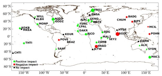 Weight-root-mean-square (WRMS) variation between the two runs (with and without HGPT2) for the station height. Green circles show stations with a positive impact, red circles stations with a negative impact, and black squares stations with no impact. The circle size indicates the magnitude of the impact: negative for values from −0.8 to −0.1 mm, and positive values from 0.1 to 0.7 mm.