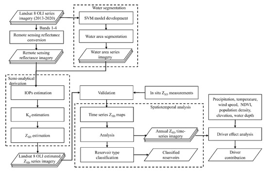 However, uses of remotely sensed data for water turbidity or clarity assessments, especially on reservoir ZSD retrieval and monitoring, is rare in Sri Lanka. Water quality deterioration is an emerging issue in a country suffering from water scarcity, where sufficient information is not available for investigation. Given the scarcity and lack of consistent data on water transparency changes, variability, and drivers, an urgent need has emerged to understand the spatiotemporal dynamics and impacts of drivers. In this study, we investigate the spatial and temporal patterns of surface water transparency in Sri Lanka, and their relations to natural and anthropogenic driving forces from 2013 to 2020 by quasi-analytically derived Secchi depth using Landsat 8 OLI data and GEE.