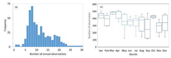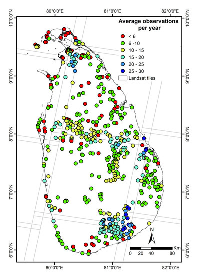 The number of clear observations of reservoirs is influenced by both cloudiness and shadowiness. Likewise, data quality is subjective to the atmospheric conditions. Cloud coverage is highly abundant around Sri Lanka and exerts great significance on the availability of suitable, good quality images [51]. After removing cloud and shadow and selecting good quality observations within reflectance range of zero and one, narrowed down the annual average observation frequency from 1 to 30 (Figure 3). Overall, reservoirs were mostly captured eight times annually, with a mean of 10.96 observations per year (Figure 4a). The median of successful observations per month ranged between 246 and 492 for the entire study period across the country (Figure 4b). Figure 4b indicates that the highest number of valid observations that occured during January, March, April and October; however, the least happened in September and November. The number of annual average observations was calculated by dividing the valid observations of each reservoir by 7.5, which is the number of years of the study period. Figure 3 shows the annual average number of successful observations for each reservoir during the entire study period with ground paths of the OLI sensor. Reservoirs located in the path overlapping regions clearly indicated a higher frequency concerning other areas. Cloud coverage peaked along the northern and north-western coastal areas of the island, exhibiting a significantly smaller number of observations per year (fewer than six).
