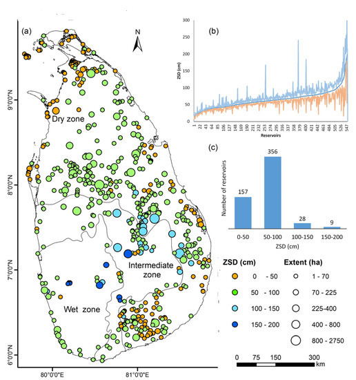 The distribution of mean ZSD showed several spatial patterns across the climatic zones. Mean ZSD was higher in the wet zone 91.05 ± 43.22 cm, then followed by the intermediate zone at 81.82 ± 29.79 cm, with the lowest in the dry zone with 59.81 ± 21.06 cm. Wet and intermediate zones had most of the reservoirs with a ZSD range of above 50 cm. Most reservoirs have the highest transparency (i.e., ZSD > 100 cm) located in these two zones. Reservoirs with the lowest transparency of ZSD < 50 cm were generally distributed along the coastal regions of the dry zone. Additionally, most reservoirs in this zone were shown a ZSD between 50 and 100 cm, while very few large reservoirs had a ZSD above 100 cm.