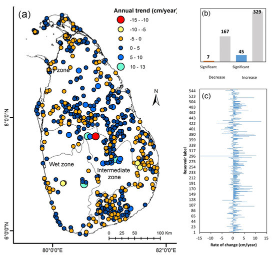 - All reservoirs in Sri Lanka exhibited a mean annual growth rate of change 1.02 ± 2.33 cm with increasing tendencies observed in 68% (N = 374) of the reservoirs. Statistically significant changes (increasing/decreasing) were observed in 9.45% of reservoirs.