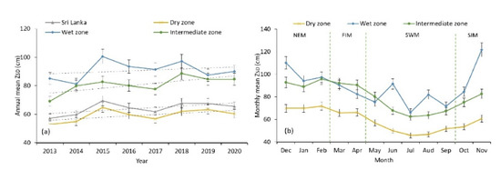 The mean monthly ZSD of the three zones are plotted in Figure 8b along with four monsoon seasons in Sri Lanka: the north-east monsoon (NEM), the first inter monsoon season (FIM), the south-west monsoon (SWM) and the second inter monsoon (SIM). Overall, all zones showed the lowest ZSD values during the SWM. Dry and intermediate zones were highest in ZSD during the NEM, whereas the wet zone had during the NEM and SIM. Except for the wet zone in the SWM, all zones exhibited a gradual decrease in ZSD from their highest occurrence season to the lowest, and vice versa. The wet zone had a fluctuation pattern during the SWM and peaked in November. Dry and intermediate zones had the highest and lowest transparency during February and July, respectively.