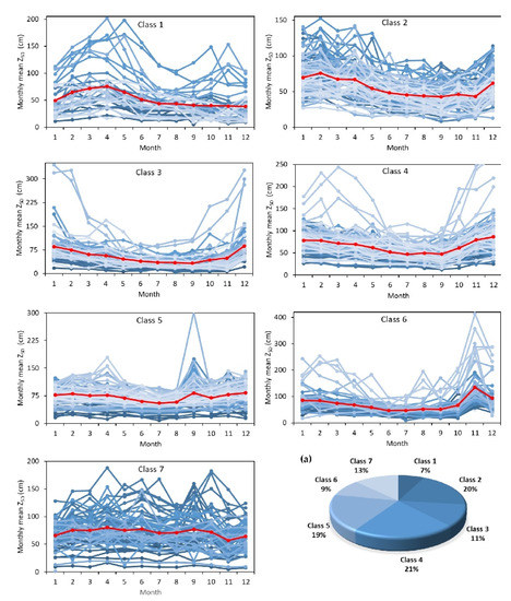 Seven classes of reservoirs according to their monthly mean ZSD. The average of all reservoirs in that class indicates in red; (a) Percentages of reservoirs in each class.