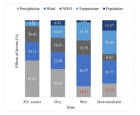 The influences imposed by the driving factors on spatial water transparency distribution differ per zone. All of the drivers, except precipitation, significantly influenced water transparency in wet and intermediate zones. In dry zone, precipitation and wind were shown to be the most significant influences. On the contrary, wind (40.57%) and temperature (23.48%) among the climate variables had significant negative and positive influences on water transparency changes in the wet zone. The population also had a negative effect in this zone. In the intermediate zone, temperature and wind had a similarly strong effect on water transparency as in the wet zone, whereas temperature had a negative association. In all climatic zones, climate factors played the leading roles in regulating the ZSD variations. Figure 10 also indicates that the impact of human population and human-induced land-use alterations on the inter-annual variations was about 26% in all three zones.