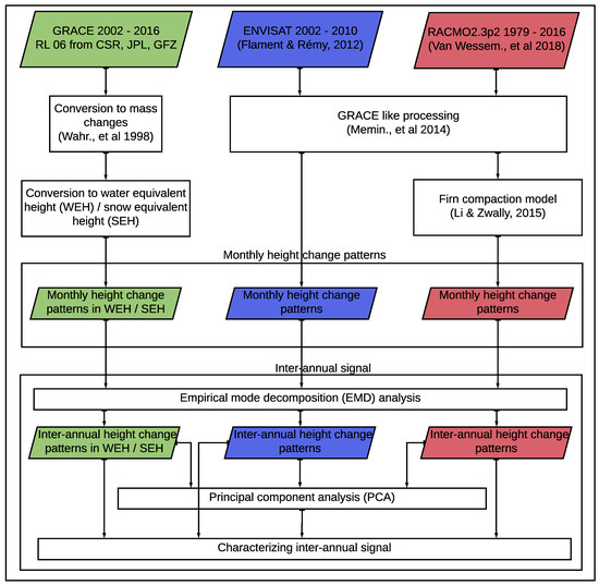 The methodology we adopt in the study is summarized as a flowchart in Figure 1. It involves deriving height change patterns from the data and observations. In the next section, we extract inter-annual signals from the monthly estimates and then characterize it.