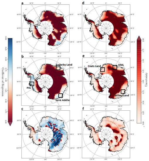 Coefficient of regression (left) and uncertainty (right) maps between height changes estimated from (a,d) Envisat and GRACE in SEH, (b,e) Envisat and RACMO, and (c,f) GRACE in SEH and RACMO, during the period 2002–2010. In the coefficient of regression maps, color indicates the magnitude, and the dark circle refer to regions where the coefficient is negative. Larger uncertainty values are indicated using dark red.