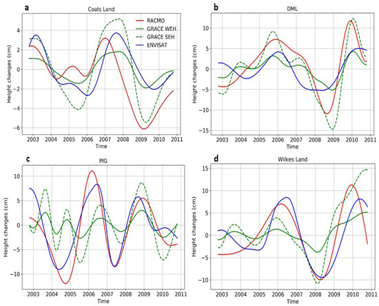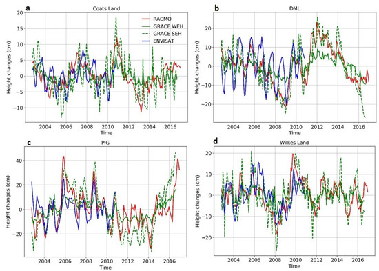 Height changes for four distant locations (Pine Island Glacier (PIG), CL, DML, WL), where we have near optimal regression coefficients and minimal uncertainties, are shown in Figure 3a–d.