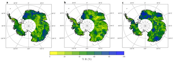 RMS reduction (in %) of the best single-period fitting model for height changes estimated from Envisat (a), GRACE (b), and RACMO (c).