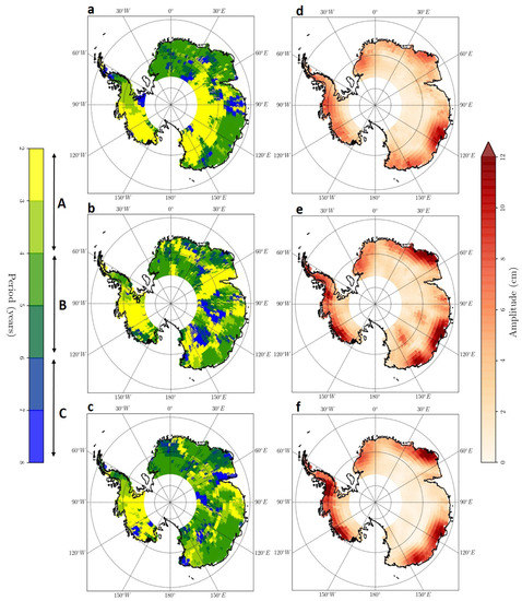 Maps of the periods (left) and amplitudes (right) of the best fitting model for height changes estimated from Envisat (a,d), GRACE in SEH (b,e), and RACMO (c,f) after EMD. The period range is broken down into three classes: A, B, and C.