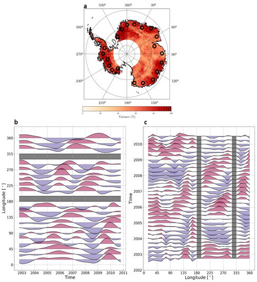 Explained variance map of the PC1 with locations (black circles) of sites selected to perform the PCA (a). Darker color indicates larger explained variance. Resulting PC1 height changes ordered by longitude (b) and ordered by time (c). The grey colored region represents ice shelves. Positive and negative anomalies are in red and blue, respectively.