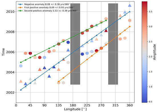 Time occurrence of anomalies in PC1 that are longitudinally successive around the AIS. Circles and triangles represent positive and negative anomalies, respectively. The color depicts the absolute amplitude of the anomaly at each location from PC1. Linear trends are estimated considering negative anomalies (blue), positive anomalies between 135 and 360 E (orange), and positive anomalies between 15 and 285 E (green), ignoring locations with variance <70%.