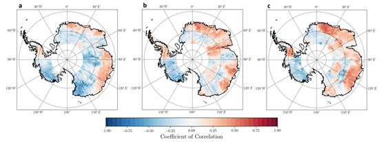 Correlation maps between ONI and inter-annual height changes estimated from (a) ENVISAT, (b) GRACE, and (c) RACMO. Positive and negative correlation coefficients are in red and blue, respectively.