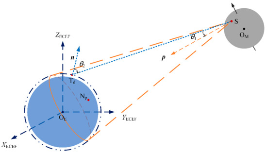 Similar to the expression of the case of the Moon-based sensor, given the coordinates of the observed point (φd, θd) and the altitude hd, the coordinates of the observed points can be written as: