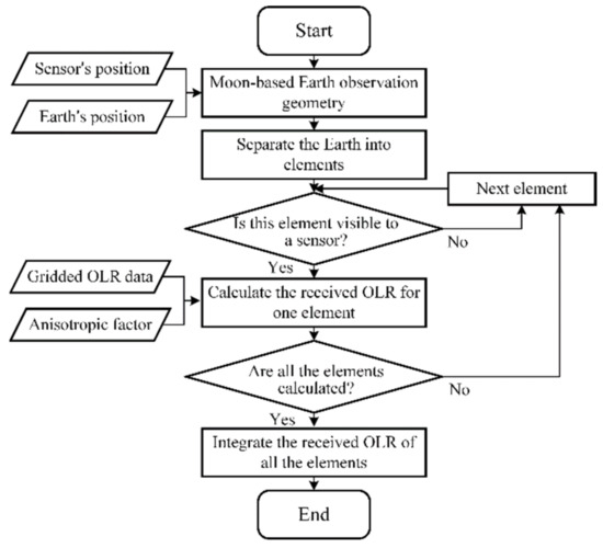 The estimation of Moon-based OLR measurements requires a number of different steps (Figure 2). The first is to build Moon-based Earth observation geometry. The geometric relationship between a sensor and the Earth’s position can be established through coordinate transformations. According to the observation principle, the measured OLR from a Moon-based sensor FL at a latitude θp and longitude φp of the nadir point within the observational scope can be expressed as