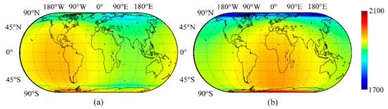 Because the basic requirement of estimating the global mean OLR is global coverage, we further analyzed the characteristics and variation in the global samplings of Moon-based Earth observations (Figure 4). The unit is the number of samples, which is calculated by judging if the point is within the observational scope. We set the duration at both the orbital period of the maximum and minimum latitudinal range of the nadir point, to present extreme cases of global samplings during one orbital period. The interval for each sampling was set to 10 min. It is clear that all regions on Earth can be fully sampled during one orbital period. The total number of samplings ranged from 1700 to 2100. Both cases show uniform distribution along the Earth’s latitude owing to the variation of the nadir point approximately along the latitude line. Based on this, we compared the samplings along the prime meridian (Figure 5). Owing to the varied lunar inclination, from the number of samplings the entire surface of the Earth can be divided into three parts, with two clear dividing lines determined by the maximum lunar inclination of the orbital period. In the region between these two lines, the samplings were more uniform, with their maximum differences are less than 100 times each. In the polar regions, different orbital periods exhibited different coverage levels, with the minimum number of samplings more than 1800, indicating adequate sampling of the polar regions from Moon-based Earth observations.