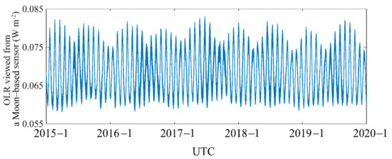 A time series of the Moon-based OLR measurements indicate a range from 0.058 to 0.083 W m−2 with a clearly cyclical pattern (Figure 6), caused by the component variation in the observational scope. As mentioned in Section 3.1, the position of the nadir point determines the observational scope. The time series approximately conformed to variations in the daily cycle, because the scenes observed by a Moon-based platform will change as the Earth rotates. As the diurnal cycles of land and oceans differ considerably [57,58], the changing portion of land and ocean will lead to changes in measured OLR. In addition, with changes in the nadir point, more high-latitude regions (northern or southern hemisphere) will appear in the observational scope. Thus, the time series also reflects orbital periodic and seasonal variations.
