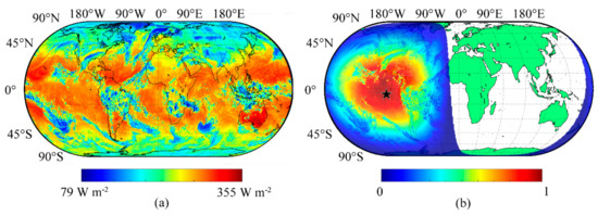 Specifically, the OLR depends chiefly on surface temperature and cloud cover (Figure 7a). It is evident that higher values occurred in the ocean and desert regions, which can be attributed to the warmer surface temperatures of these regions. Clouds also play an important role in the value of OLR by causing lower radiation at the TOA. The maximum OLR occurred over the sub-tropics with low cloud cover [59], while a local minimum was recorded near the equator, corresponding to cold temperatures at the cloud top [60]. To investigate the distribution of OLR in the observational scope (Figure 7b), values were normalized to amplify the contrast of the OLR at different positions within the observational scope. Owing to the effects of the Earth’s curvature, it is clear that the values at locations near the nadir point contribute more to Moon-based OLR measurements generally, expect for regions where the emitted OLR is extremely low. In addition, the values decrease with an increase in distance to the nadir point. However, if the OLR at a particular position is too small, for example at Amazon Rain Forest, (Figure 7b), the contribution from this region will be far less than from other regions near the nadir point. The contributions of the OLR at different positions to the integral measurements were determined using the OLR values and the relative position to the nadir point.