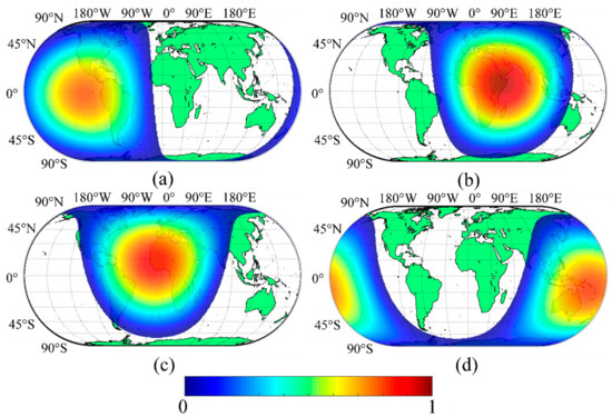 Using Equation (19), it is clear that integral measurements can be treated as the sum of the Hadamard product of the OLR data together with the anisotropic and geometric factors. The geometric factor determines the observation geometry of the Moon-based OLR measurements and, for these type of integral measurements, it is necessary to investigate the effect of geometric factors on Moon-based OLR measurements. Firstly, we present the distribution of the geometric factor in the observational scope to show the distribution characteristics and compare four specific observation times during one orbital period and, then we present the effects on Moon-based OLR measurements (Figure 8). To better understand the contrast in magnitude, we normalized the geometric factors of one orbital period. From our result, it is evident that the geometric factor of the observed points reaches a maximum near the nadir point, while the value is lower near the limb of the observational scope. This is due to the effects of the Earth’s curvature. Thus, for an almost hemispheric observational scope, the viewing zenith angle is the most important factor affecting the distribution of the geometric factor. The cosine of the viewing zenith angle approaches 1 near the nadir point, while the value decreases towards 0 when located at the limb of the observational scope. Although other factors, such as the angle between the pointing vector and the light ray, can also affect the results, the effects are too small to cause significant changes in distribution. By comparing the distribution at perigee and apogee (Figure 8a,b), we found that changes in observation distance affect its maximum value, and further result in differences with the changing observational scope. For the maximum inclination (Figure 8c,d), a large inclination did not affect the area of the observational scope, and only the distribution of the geometric factor near the polar regions changed slightly in the observational scope because of the smaller area of the element.
