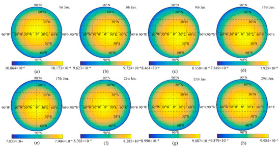 Distribution of the geometric factor (sr) on the near-side of the Moon during one orbital period; (a–h) represent the distribution for January 2020, with a four-day interval.