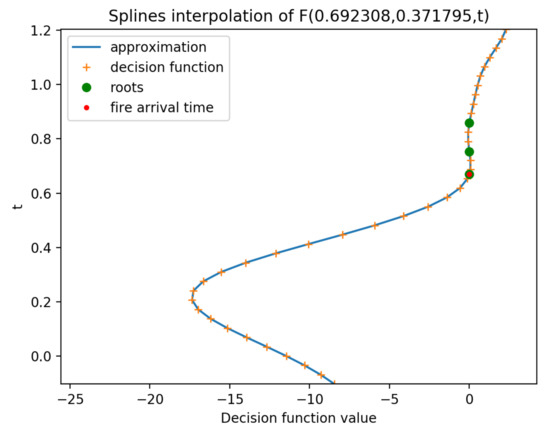 Figure 4 shows an example of the three roots of the piecewise polynomial approximation of the vertical profile values of the decision function at a fixed location (green circles) and the minimum t root of the same approximation (red circle). This minimum t is what will be defined as the fire arrival time at this fixed location. This process is repeated for each point in the domain. The fire arrival time estimation described in this section is part of the python code included in the Supplementary Materials section at the end of the paper.