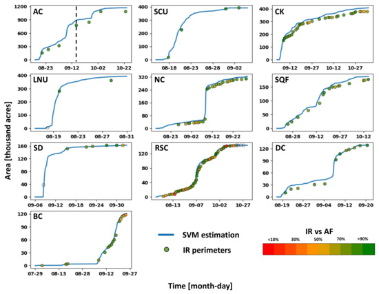 Figure 8 depicts the SC (black line with dots) for the top 10 largest wildfires of 2020 in California at every IR fire perimeter time. The dashed black vertical line represents the time of the August Complex (AC) wildfire snapshot showed in Figure 5 and Figure 7. Overall, SC values are close to 1, indicating a high spatial agreement between the fire extent estimated by SVM and derived from IR fire perimeters. The SC tends to increase over time as it is gradually easier for the SVM method (based on relatively coarse satellite data) to accurately capture the fire area as the number of fire detection pixels increases. Consequently, some of the lowest agreement values occur at the time of the first IR fire perimeter when the number of fire pixels is low due to the small fire extent (see initial fire burned areas for LNU, RSC, and BC fires in Figure 6). Furthermore, in Red Salmon Complex (RSC) fire, there are sudden and abrupt changes in the SC value. These fluctuations are caused by the abundance of observed IR fire perimeters for this particular case, which provided very frequent fire perimeter scans.