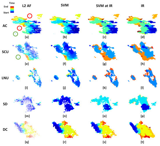 The first two columns of Figure 9 visualize how the SVM method integrates the satellite data into a continuous fire progression. For instance, looking at the August Complex (AC) and SCU Lightning Complex (SCU) wildfires (Figure 9a–h), it can be seen that this method ignores fire detection pixels of low confidence level (red circles) while preserving small fires for cases where the confidence level of those detection pixels are high (green circles). The two isolated dark blue detection pixels in the north-center and center-west surrounded by a red circle in Figure 9a are filtered out and are not present in the SVM results shown in the next column (Figure 9b). However, at the same time, the SVM still preserves small fires, like the south-west cyan one (surrounded by a green circle in Figure 9a), as long as the confidence of the detection pixels is high. A closer examination of the fire detection pixels in this region revealed that these pixels correspond to the much smaller Oak fire that was not mapped by NIROPS focused on the August Complex fire. A similar situation happens with the SCU wildfire, where the method is able to distinguish a much smaller fire not mapped by NIROPS, the Coyote fire (detection pixels surrounded by a green circle in Figure 9e).