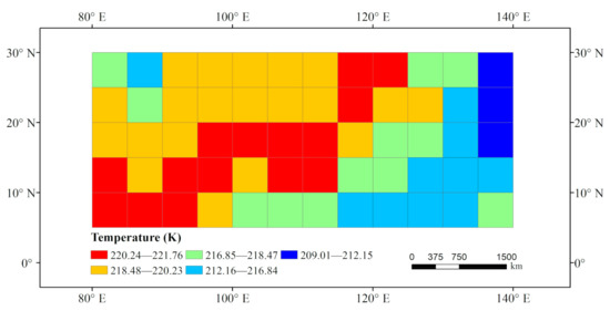 We calculated the average temperature of the Tianwen-1 landing period (sol 81–111), corresponding to Martian years 29 to 32. Using these temperature data, we drew a surface temperature map to help understand the spatial pattern of the surface temperature in the study area. Figure 3 shows the average surface temperature during sol 81–111 from Martian years 29 to 32.