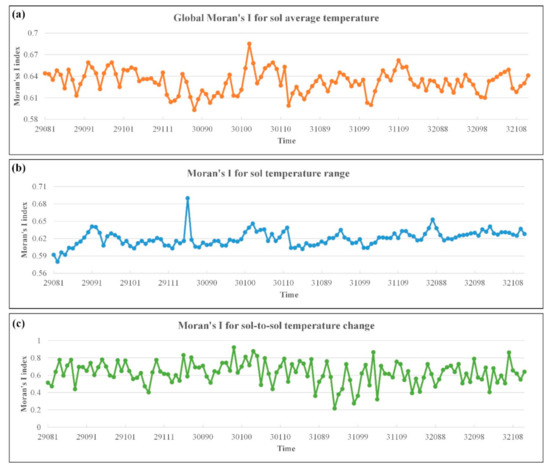 The Moran’s I was introduced to estimate the global spatial correlation for sol average temperature (SAT), temperature range (STR), and sol-to-sol temperature change (STC). The results of the Global Moran’s I for the SAT, STR, and STC during sol 81–111 from Martian years 29 to32 are shown in Figure 5.