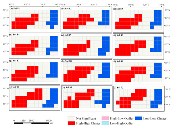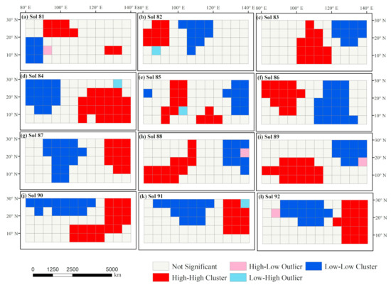The Local Moran’s I was conducted to test for local spatial autocorrelation in the sol average temperature (SAT), temperature range (STR) and sol-to-sol temperature change (STC) during sol 81–111 from Martian years 29 to32 in the study area. We created agglomeration maps for SAT (Figure 6), STR (Figure 7), and STC (Figure 8) based on local indicators of spatial association (LISA) [11]. The agglomeration maps include high–high (HH), low–low (LL), high–low (HL), and low–high (LH) clusters.
