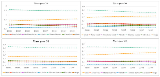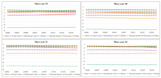 The GTWR regression model considers the fluctuation in variables over time. The variation in the regression coefficients of each Martian sol over time based on the GTWR was obtained. We mapped the temporal trend for the coefficient of independent variables (albedo, thermal inertia, zonal wind, meridional wind, elevation, dust, and slope) for SAT (Figure 9) and STR (Figure 10) during 81–111 sol from Martian years 29 to 32.